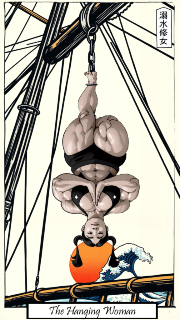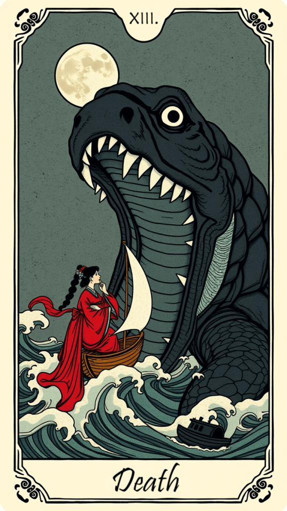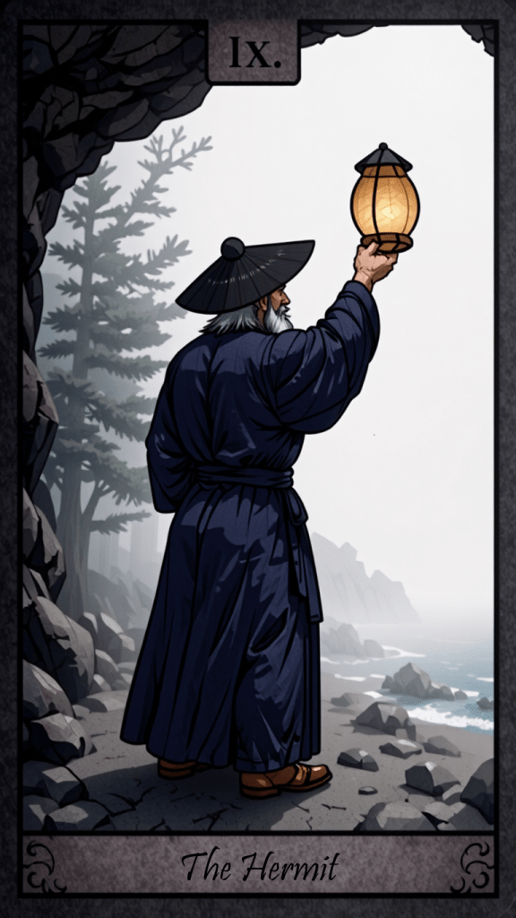 WHY THE HERMIT? The Hermit’s journey is a descent into the self. The Umibōzu is the personification of that deep, dark, silent inner space. It represents the intimidating but necessary step of confronting the vast unknown within. The wisdom it offers isn’t in words, but in the silence it commands. It forces a complete halt to the external journey, compelling the sailor (the seeker) to look into the abyss. It is the ultimate symbol of soul-searching and the profound truths found only in deep, contemplative solitude.