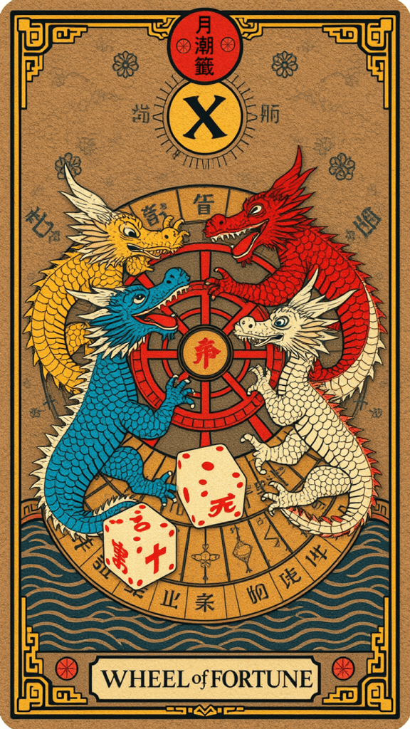 TALE: In the era of shifting winds, the Eastern Sea Dragon King built a beacon-tower to tame the tides—a golden spire that claimed to measure all currents, to name all storms, to command all sea-spirits. But his daughter, Xiǎo Lán, the ninth-born of his brood, inherited the soul of the tide itself. She warned: “You cannot measure water without betraying it.” He ignored her. On the ninth typhoon of the ninth year, she rose in spiral wrath, tearing the tower from its roots and drowning her own kin who tried to defend it. The Dragon King wept, but the maelstrom would not relent until every stone sank. Since then, when pride builds towers over tide, her nine vortexes return to cleanse the arrogance of certainty. WHY THE TOWER? Her maelstrom is not punishment—it is the wave that removes what should never have stood. KEYWORDS (Upright): Bēng hǎi (崩海) – Collapsing sea Lóng hāi (龍咳) – Dragon’s cough (storm as rejection) Duàn lónggǔ guāng (斷龍骨光) – Keel-breaking light KEYWORDS (Reversed): Jiǎ tǎ (假塔) – False tower Yān mò (淹沒) – Self-chosen drowning Nuò máo (懦錨) – The coward’s anchor