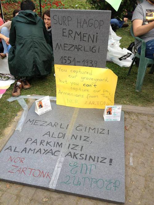 What the media hasn’t pointed out is that the said disputed park actually has a long and controversial history. Armenian protestors at Gezi park have been carrying signs that read in Turkish, Armenian and English: You captured our graveyard, but you can’t capture our park!