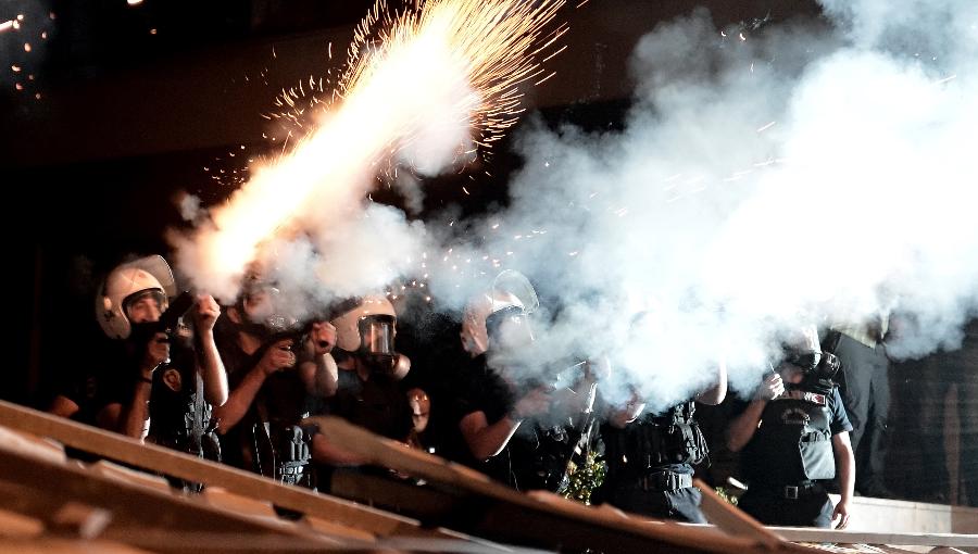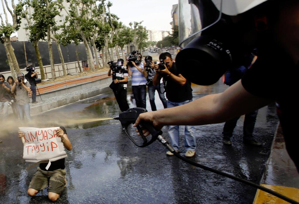Turkish riot policeman uses tear gas during a protest in central Istanbul