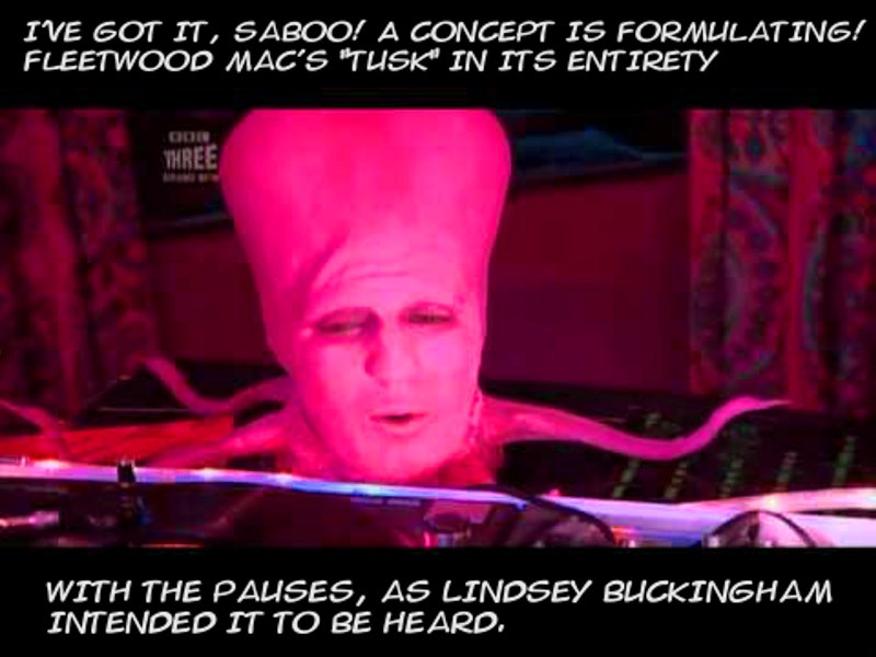 Tony Harrison: [Saboo and Tony Harrison are DJ-ing] I’ve got it, Saboo! A concept is formulating! Fleetwood Mac’s “Tusk” in its entirety!