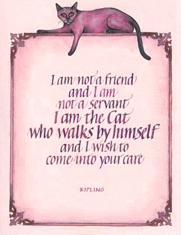 Then the Woman laughed and said, ‘You are the Cat who walks by himself, and all places are alike to you. Your are neither a friend nor a servant. You have said it yourself. Go away and walk by yourself in all places alike.’