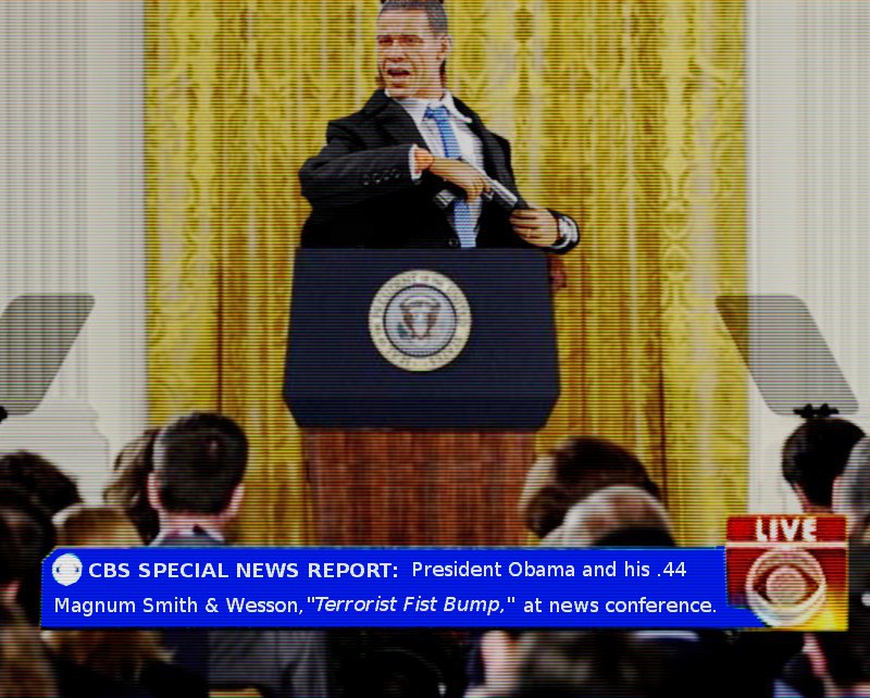 President Obama exhibits his .44 Magnum, “Terrorist Fist Bump,” to various members of the associated press.
