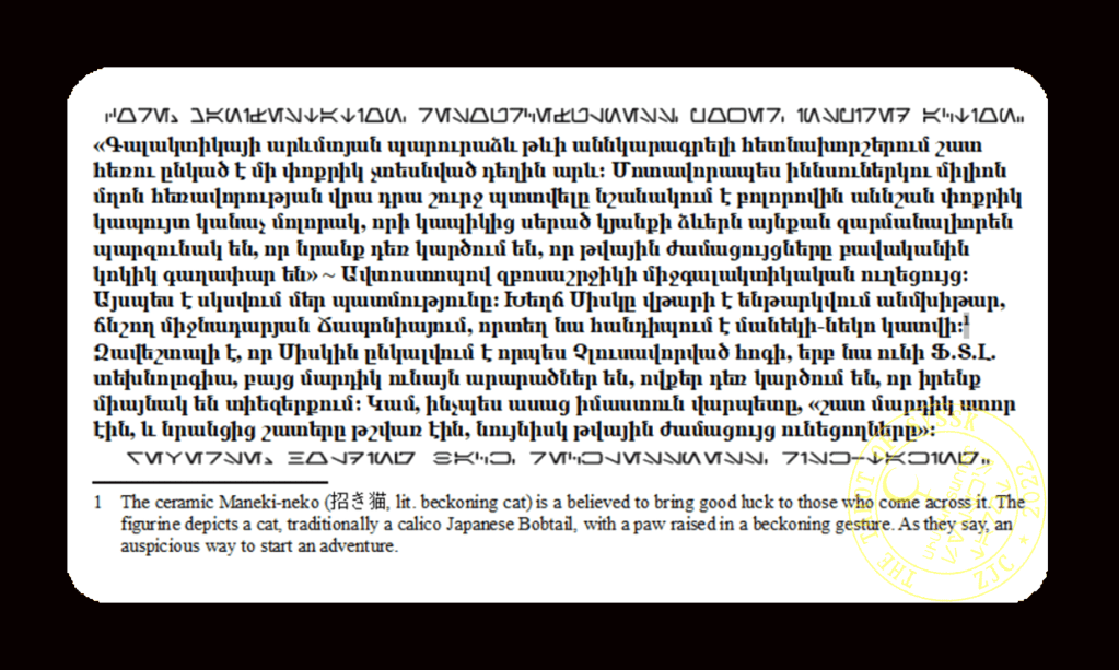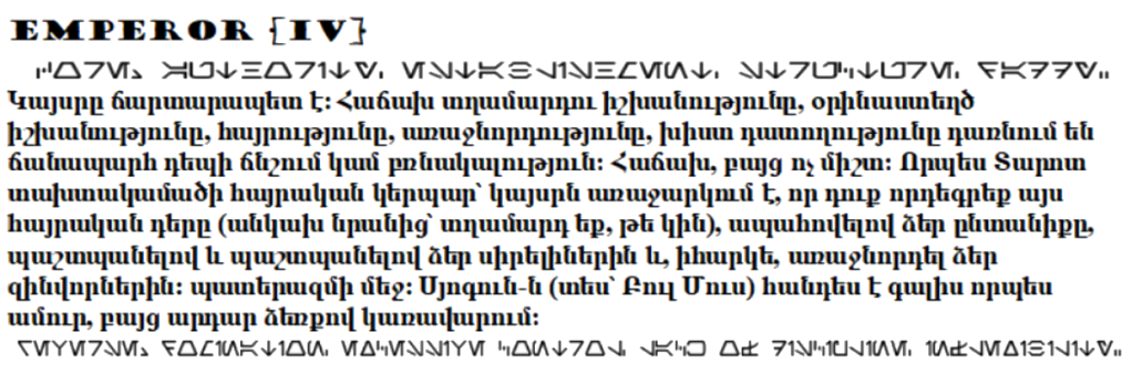 Each card is written in English, as well as Japanese and a made-up language called Galactic Basic (Syssk’s mother tongue). Since a lot of choices that I made fall under the “Rule of Cool” heading (see: it seemed like a good idea at the time) in hindsight I see how foreign languages might be confusing, as if they’re hiding vital information needed to understand each card. They’re not. They could be removed entirely and the card would still be the same.