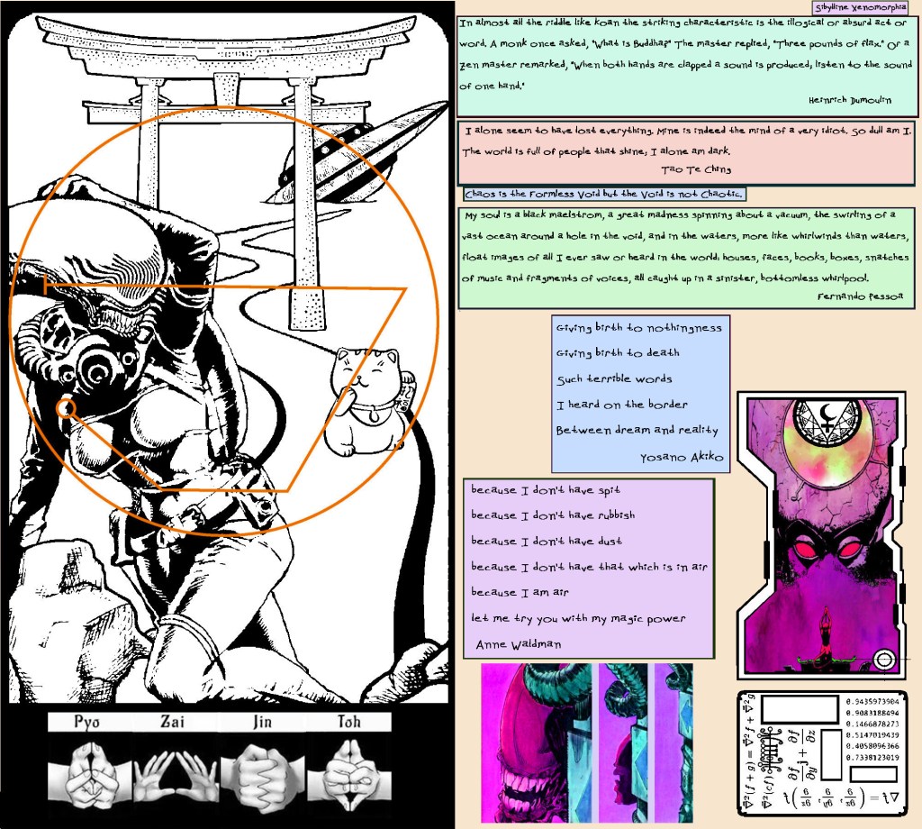 Notes: One of the curious strengths of Shintoism is its willingness to blend in with other, outside religions. Like the dancing found in the High Priestess, here a Shinto priest dances to Syssk’s drumming, while Buddha and a Taoist monk look on.