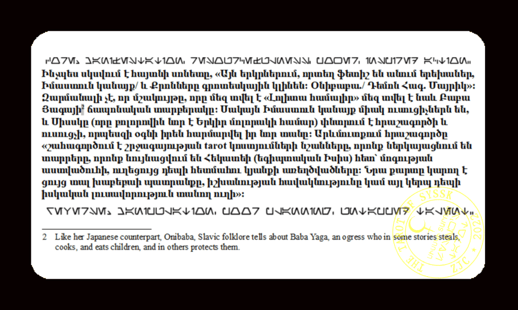 Notes: A trope that runs through some horror literature is the idea that monsters, while they can assume the shape of a mortal, are often undone when their shadows reveal their true, monstrous form. Of course this only works if a person is observant enough to pay attention to such things and not, as Syssk and her friend are doing, get caught up in fantastical story telling, oblivious to the danger sitting right in front of them. Often we think that the storm we must face is far off and we have time to recover, when, in fact, it has already consumed us.