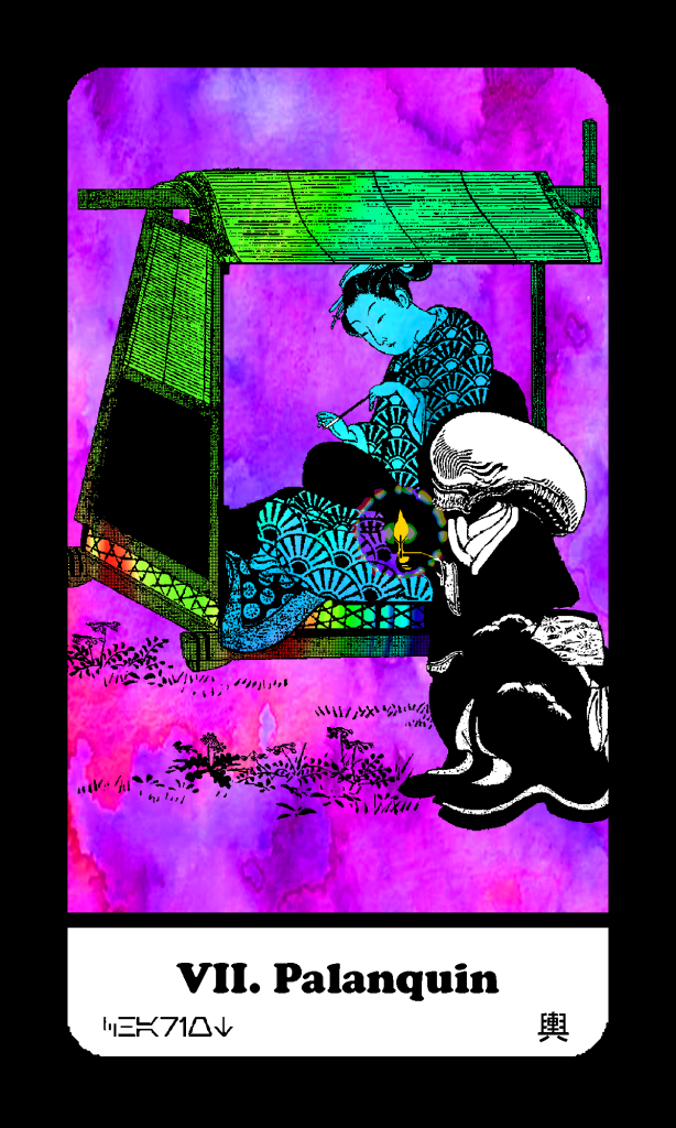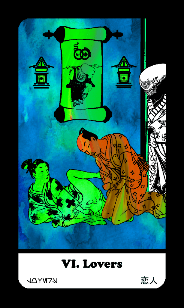 Notes: In Japanese folklore, Kitsune are trickster fox spirits that have the ability to shape shift into human form. The card speaks to the 4 of Sword’s warning that a sinister shadow might be concealed in the most charming of outer appearances. In this case the Kitsune is using a life-size puppet to manipulate others, while Syssk, jamming on her biwa in the background, remains oblivious to any danger.