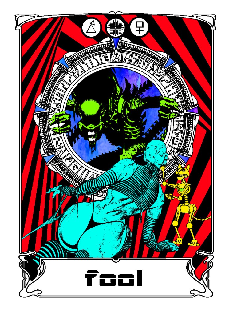 Notes: The Barbara Walker Tarot talks about the 6 of Cups being about childhood traumas and memories. Of course Syssk would also have some sort of parent somewhere and in this case it is Xenomorph Queen from the Alien franchise. It’s a side of her past that she doesn’t like to talk about, probably because the only thing xenomorphs seem to do in these movies is drool and screech … so much alien drool. Some families are so embarrassing that the only thing you can do is change your name and flee to an utterly insignificant little blue-green planet whose ape-descended life forms are so amazingly primitive that they still think digital watches are a pretty neat idea. (Thank you, Douglas Adams)