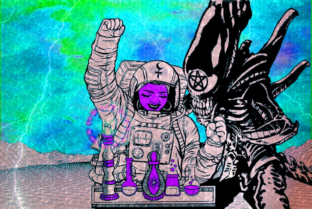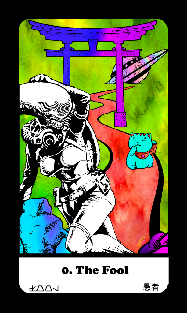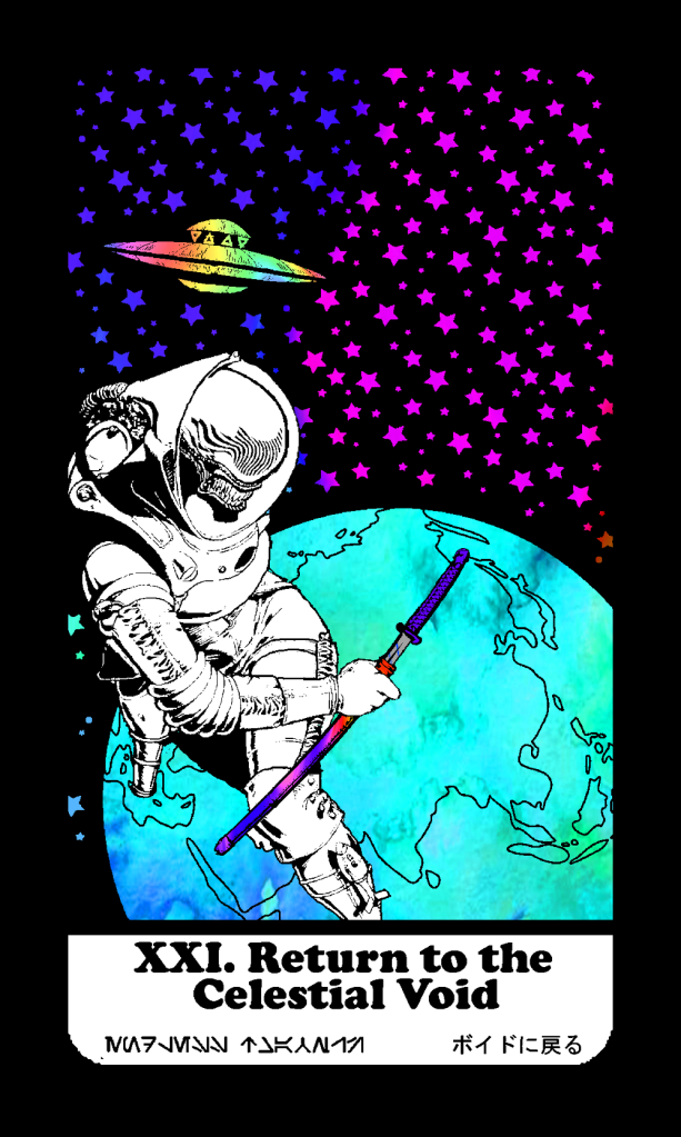 Notes: In The Rider-Waite deck, the World is all about completion. Here Syssk’s exile on Earth is over. Her rainbow UFO is fixed, she leaves terra firma for the celestial heavens, clutching her beloved katana sword, the only souvenir of her adventures that she takes with her.