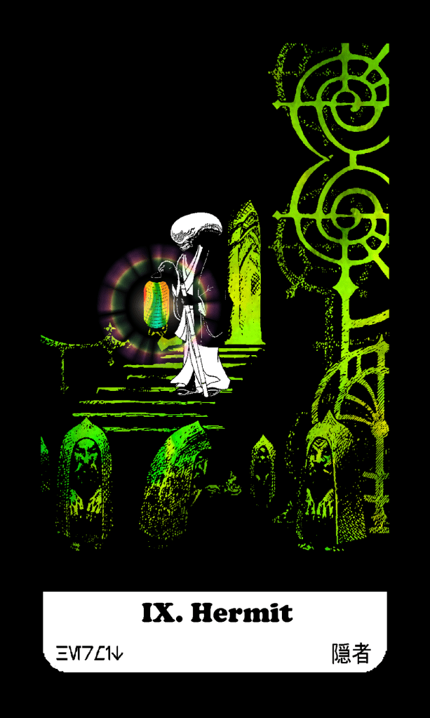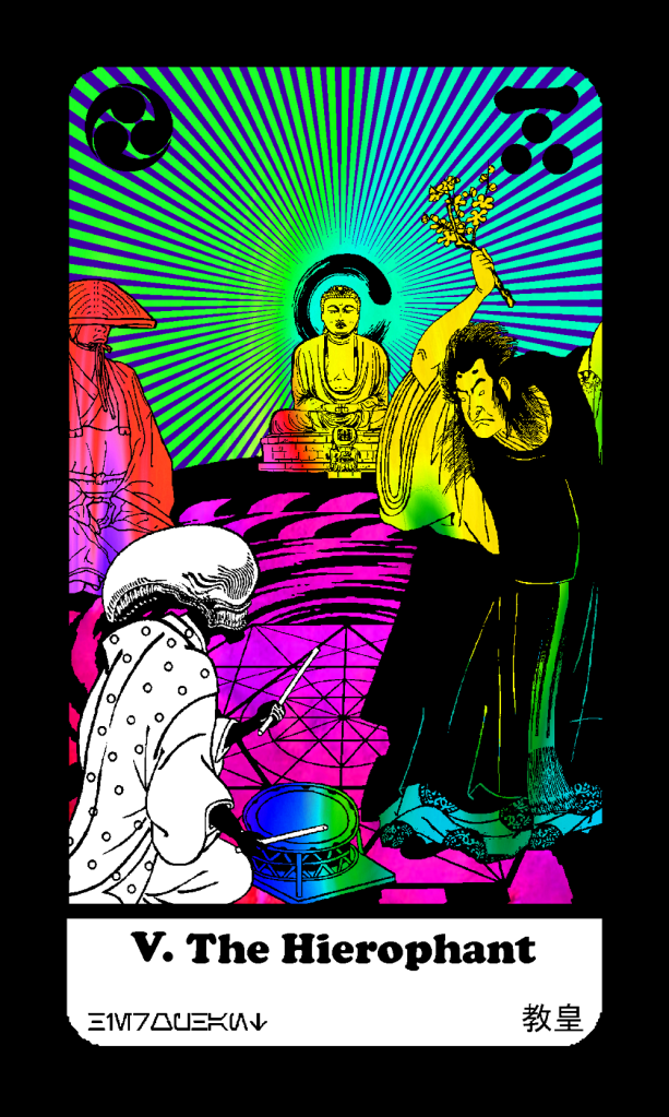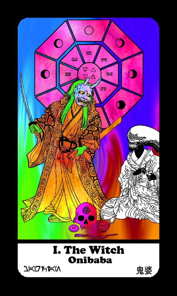 Notes: Onibaba literally means, “demon woman,” and plays many roles associated with European witches and witchcraft. The symbol behind her is a bagua, used in Taoist magic to represent the fundamental principles of reality. Because this card corresponds to the Magician, I included the four elemental symbols of water, air, fire and earth, as well as a cup, a coin, a wand and a pentagram to round things out. For more information on Onibaba, I suggest Kaneto Shindo’s 1964 masterpiece of the same name.
