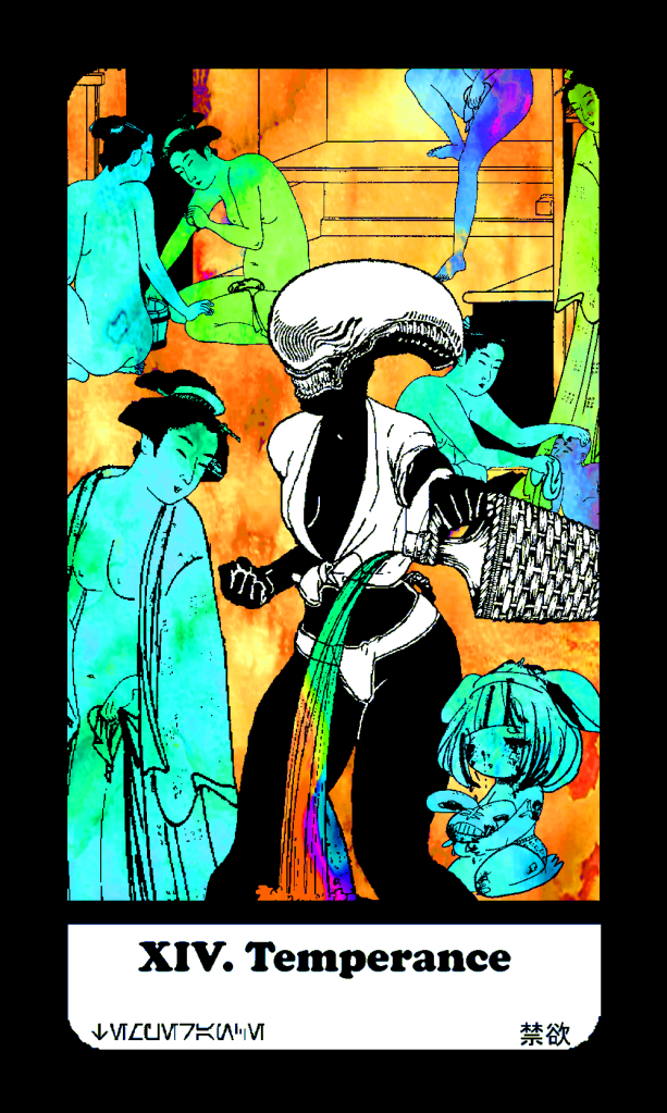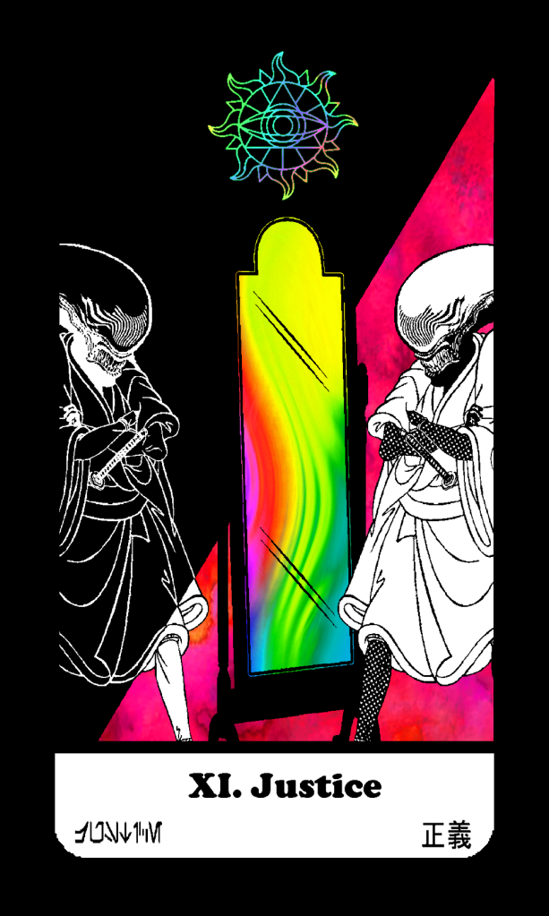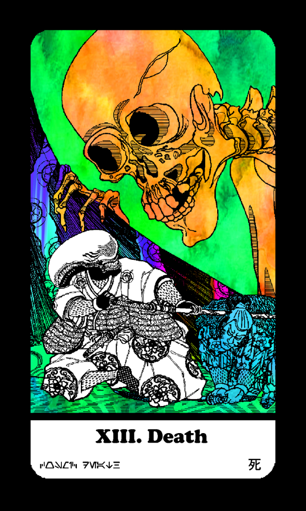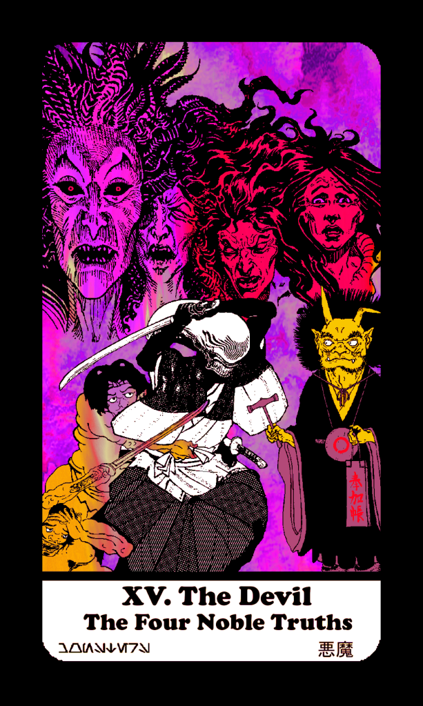 Notes: In The Rider-Waite tarot, The Devil is all about unhealthy attachments, restrictions and fear of one’s own sexuality. In other words, all the negative aspects of your personality that you need to work on. Here I focused on an idea from Buddhism that there are four aspects of being human that no one can escape from: that [1] we all suffer, [2] our suffering has a cause, but also [3] there is a solution to end our suffering and it’s up to you to decide if you want to [4] do what it takes reach that end. The Four Noble Truths. The demon on the right side of the card comes from an ancient legend about an Oni (a mountain demon) who fell in love with Buddhism and decided to walk the path of enlightenment, even though everyone else would still only see a monster. This is, ironically, the same situation Syssk finds herself in but instead of seeing a kindred soul all she sees is an Other (an Other othering another).
