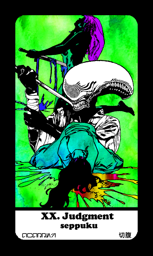 Notes: Even if a person knows nothing about Japanese history they’ve probably at least heard of the warrior-class called the samurai and how they often committed hara kira (seppuku) ritualized cutting open of their stomachs to atone for some sort of sin. In The Rider-Waite deck, uses the Christian idea of divine judgment, with Archangel Gabriel blowing a horn and zombies rising up out of the ground, hungry for brains. Here, though, the day of judgment is always at hand since your lord might, for any reason at all, order you to commit suicide in one of the more painful ways imaginable. No salvation, no good deeds or bad deeds weighing down your soul, no sitting at the right hand of the Patriarchy, just the atrocious need to save face and the horrific lengths that some people will go to carry out their lord’s wishes.