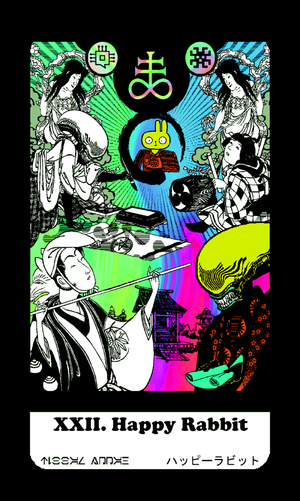 Notes: This card can be left out, if one wants. It is modeled after the Happy Squirrel, a joke that appeared in an episode of The Simpsons, when Lisa goes to get a reading done. (“Is that bad?” “Perhaps, the cards are vague and mysterious.”) It has since shown up in actual decks, though for the life of me I cannot figure out what to do with it besides give a nod to Stan Sakai’s epic tale of Usagi Yojimbo, a masterless samurai rabbit, who wanders the roads of Edo-period Japan and was a big influence in my formative years. I reused two of figures from the 10 of Wand’s Mistress of Artful Trickery (a kitsune fox-spirit) and drummer.