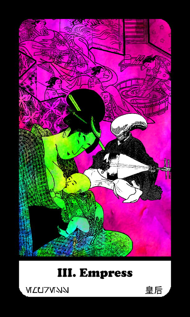 Notes: While the Empress here is the same as found in The Rider-Waite deck, the background depicts what royal childbirth was like in ancient Japan, which I found fascinating.