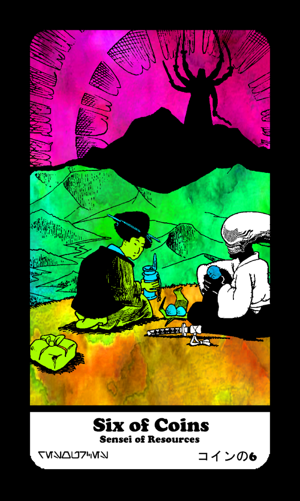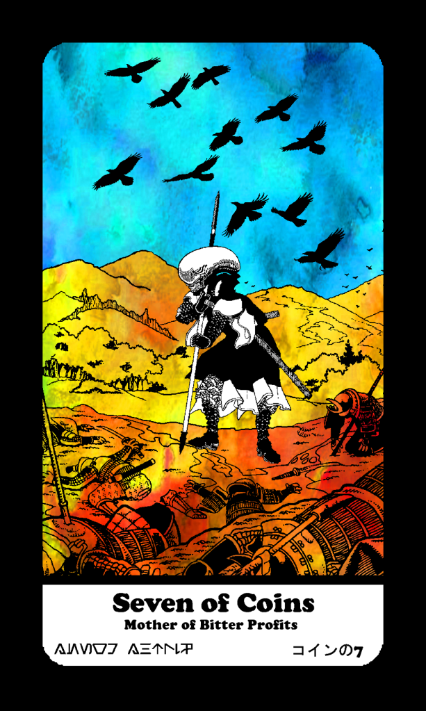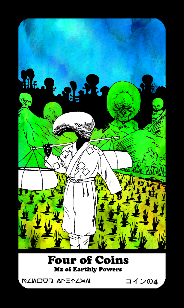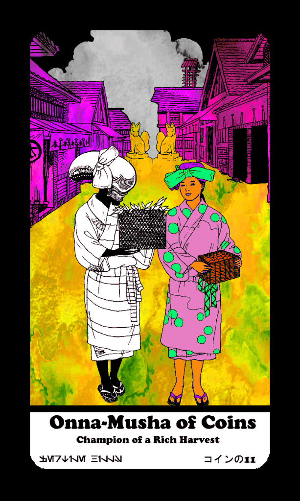 Notes: Corresponding to the Page of Pentacles, here Syssk and a friend have come to sell the rich harvest of the 4 of Coins at market. There is some debate about whether female samurai existed (why it is important for some people to say that historical warriors, like Hangaku Gozen, Nakano Takeko, Niijima Yae and Ohori Tsuruhime weren’t samurai, but rather simply high ranking women from samurai families, trained in the Way of the Blade, who fought in battles, I don’t know) however, the term used to describe such people is Onna-Musha. The nice thing about telling a story of a xenomorph marooned on Earth is that no one will accuse me of being historically accurate; if you can suspend your disbelief long enough to accept Syssk you can also embrace Onna-Musha as samurais as well, I suppose.
