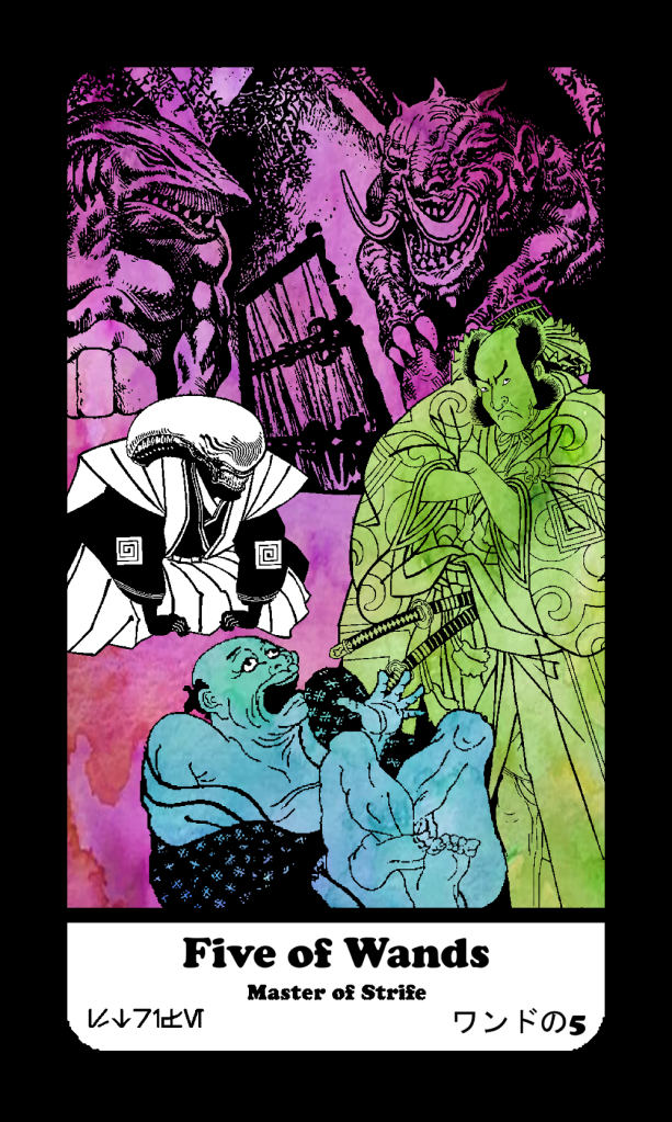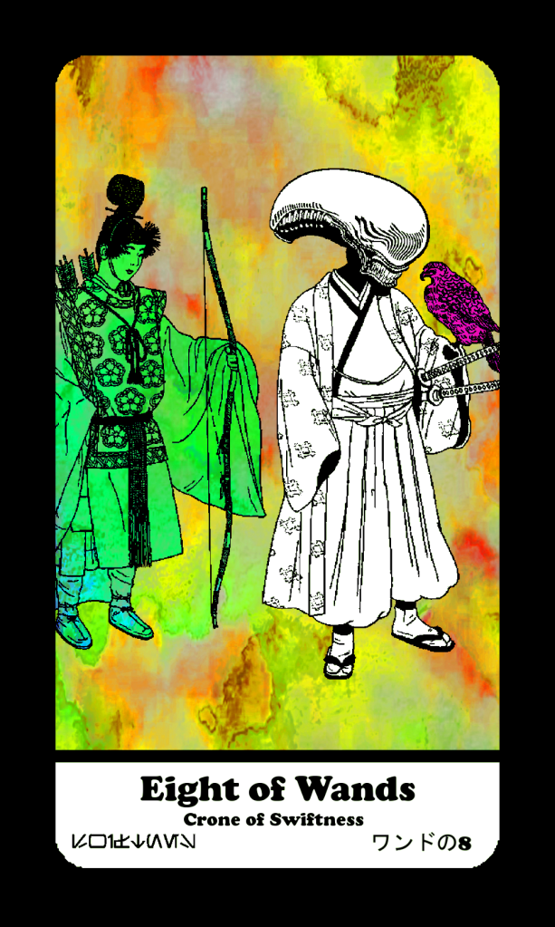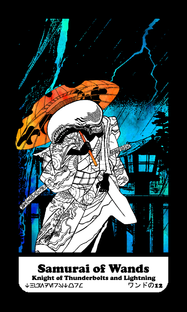 They say a creative project is never done until the creator walks away from it. This deck is still a work in progress. A lot of these designs, “seemed like a good idea at the time,” but outside of having a Tarot about an alien marooned in ancient Japan I have no problem changing anything if it isn’t working.